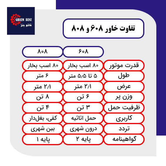 خاور 808: این مدل کمی از خاور 608 بزرگتر و قدرتمندتر است و برای حمل بارهای سنگینتر و مسافتهای طولانیتر مورد استفاده قرار میگیرد. خاور 808 دارای موتور 6 سیلندر 10 دنده دستی است. این نوع کامیون معمولا در پروژههای ساختمانب و حمل مواد سنگین مثل مصالح ساختمانی و فلزات استفاده میشود.